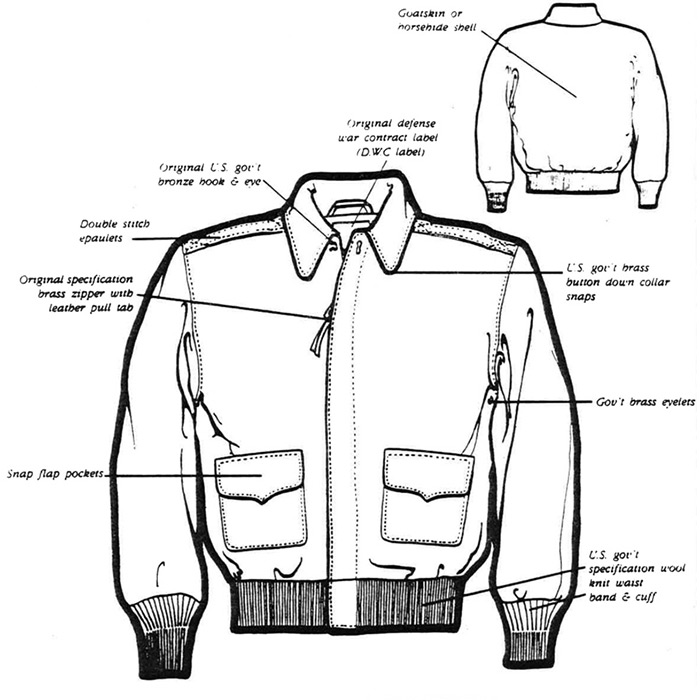 The original specifications called for snap flap patch pockets and collar with a “hook and eye” neck closure plus double diamond stitched epaulets finished with wool wristlets and waistband.