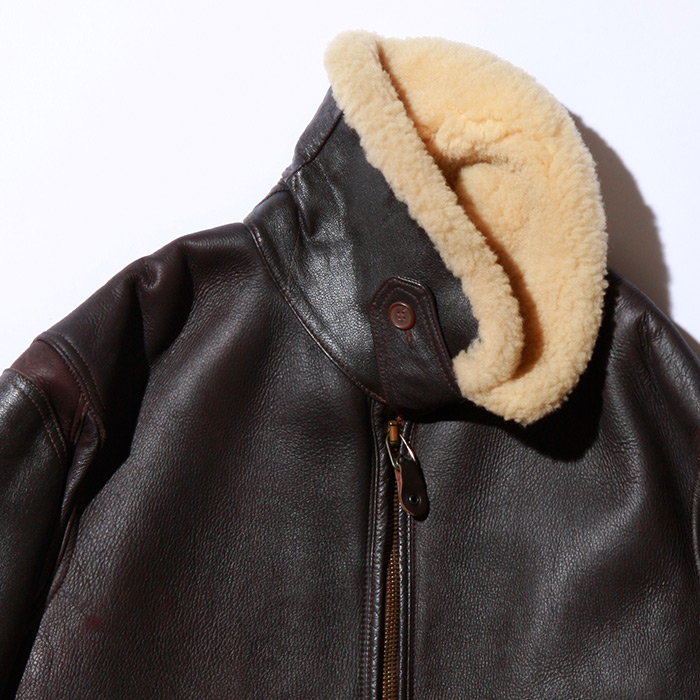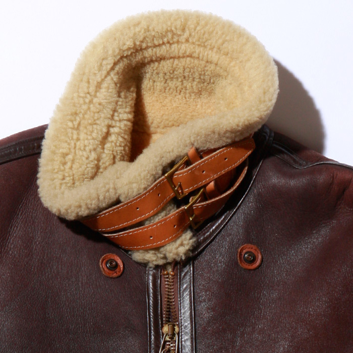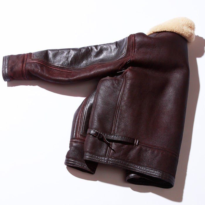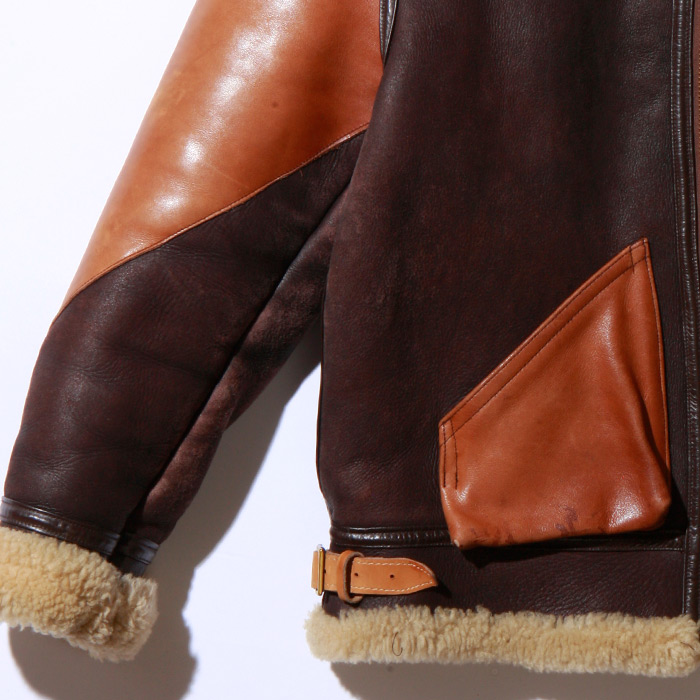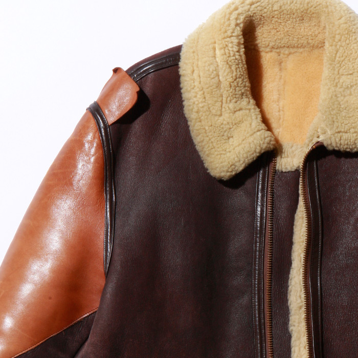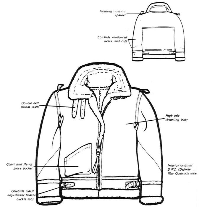U.S. Army Air Corps B-3 shearling flight jacket with cowhide trim, floating epaulets, and glove/map pocket was first issued in May, 1931. It is still constructed using the original specifications.