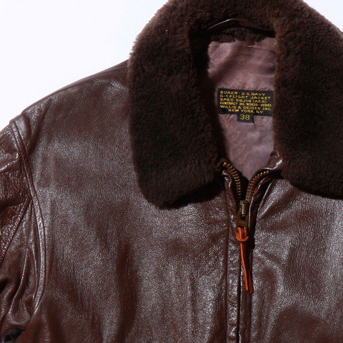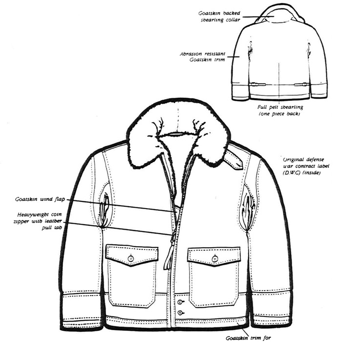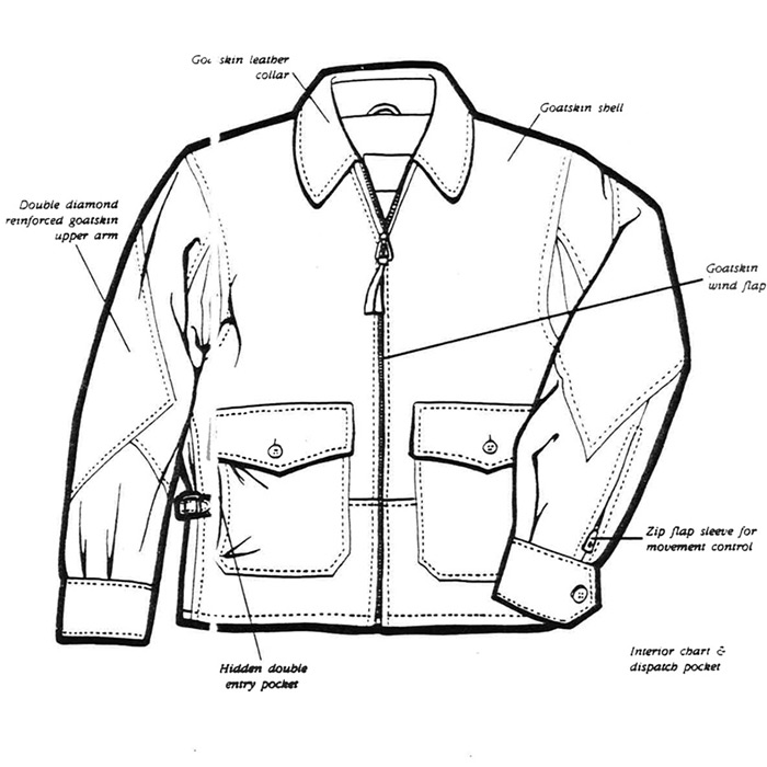 All sleeves, sleeves ends, pockets, underarm gusseted tabs and waistband are goatskin. The high collar and wind flaps are key elements that assure this is the same construction as the originals made by Willis & Geiger
