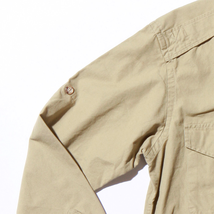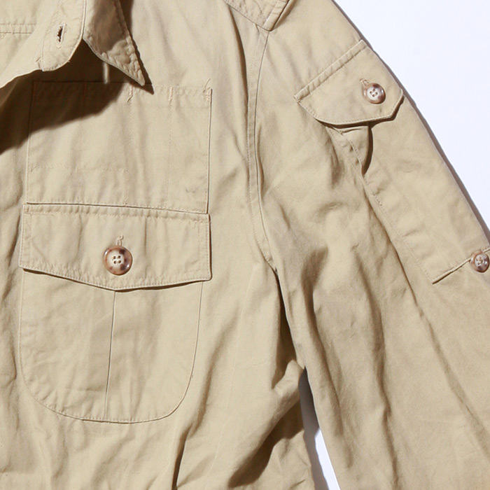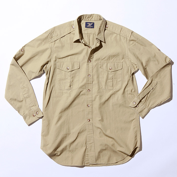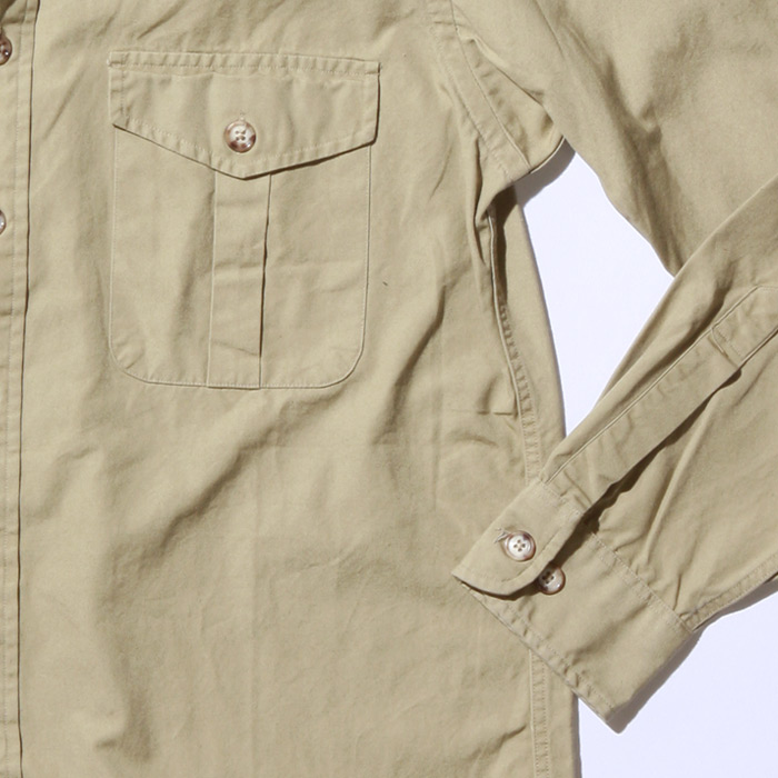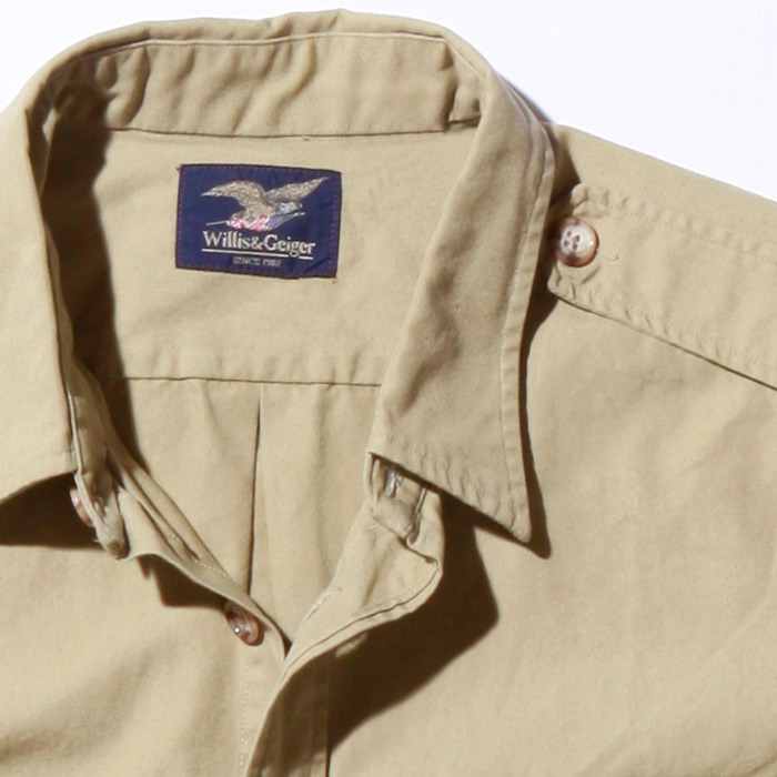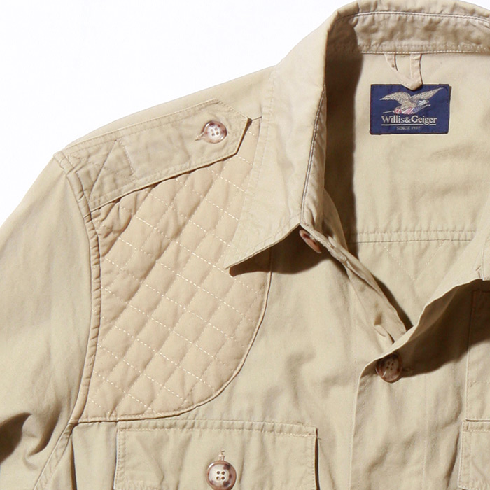 Willis & Geiger long roll sleeve shirt with button hold tabs has heavy duty cross, sewn working epaulets. deep bellows reinforced corner flap pockets; 2 box pleat back with locker tabs.