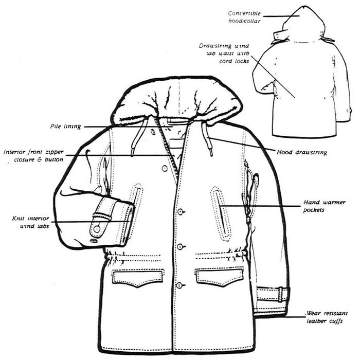 Adjustable wind tab waist; deep hand warmer pockets; a collar that zips quickly to a hood; deep materials handling covered side pockets; knit windproof wristlets and wear resistant leather cuffs make this the most practical car coat length parka available today. Button out blanket liner from wool worsted thinsulate inner lining.