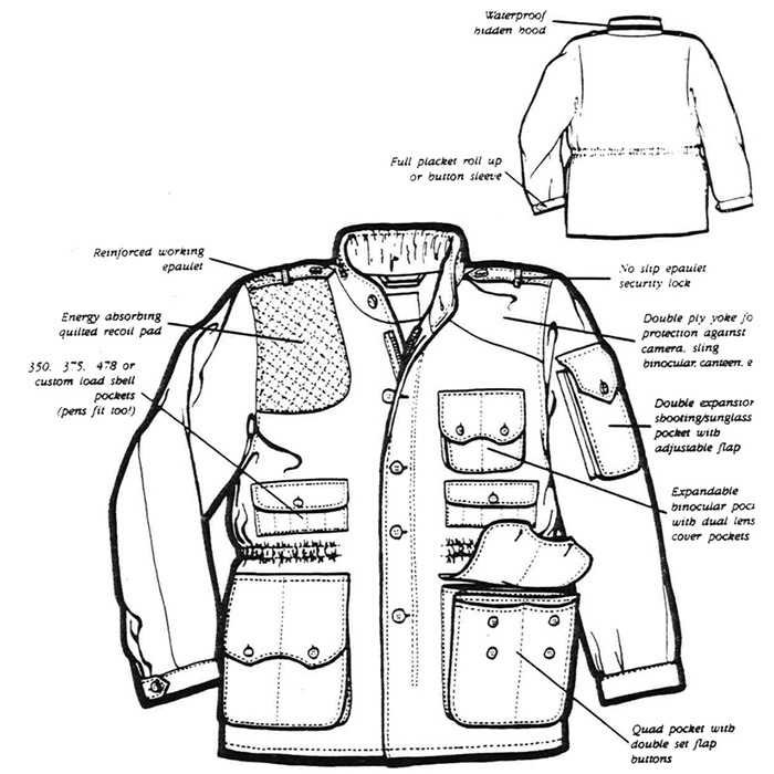 No loose belt; center vent belted back; sleeve pocket for glasses; quilted recoil pad and shotgun shell loops; all combined with full lower and upper bellows pockets to make the best bush jacket for the hunter/adventurer.
