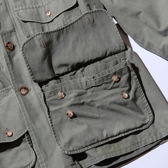 Double compartment sun/shooting glass sleeve pocket gusseted sleeve ends for easy roll up while the jacket is on; adjustable waistband to keep out Safari ants; covered cartridge loops. Binocular pocket complete with lens cover compartment.